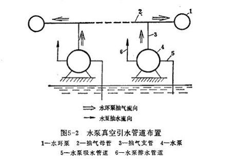 如果泵站中有兩臺以上的水泵,則可將水環(huán)式真空泵進氣管與抽氣母管相通,每臺泵的泵殼頂部通過抽氣支管與抽氣母管相連。在每個支管上都安裝一個閥門,以便可以單獨對每一臺泵抽氣。有時,為了備用起見,可以設置兩臺水環(huán)式真空泵,每一臺的進氣管上都安上閥門。當一臺發(fā)生故障時,可以關閉該泵上的進氣閥門,利用另外一臺抽氣,不致耽誤水泵的起動。正常情況下兩臺水環(huán)式真空泵可對水泵同時抽氣,以加快引水速度。整個管路布置如圖5-2所示。