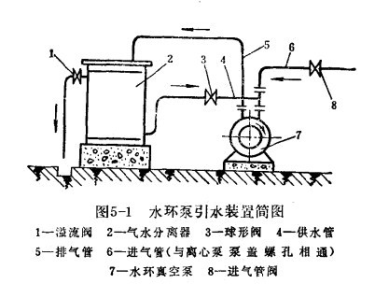 水環(huán)式真空泵引水裝置如圖5-1所示。水環(huán)式真空泵的進氣管6與水泵泵蓋的頂部相連,在沒有自來水的地方,必須配置氣水分離器,作為真空泵冷卻水和補充水的水源。