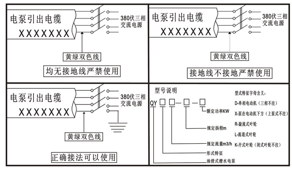 1.引出電纜中一根帶有接地標志的黃綠雙色芯必須接地線。如無固定地線,可用2米金屬棒埋入河湖岸邊,水溝邊或潮濕的土中作地線。