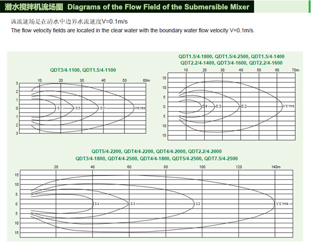 潛水?dāng)嚢铏C(jī)的選型是一項(xiàng)比較復(fù)雜的工作,選型方案的正確與否直接影響到設(shè)備的正常使用,作為選型的原則就是要讓攪拌機(jī)在適合的容積里發(fā)揮充分的攪拌功能,這個(gè)標(biāo)準(zhǔn)一般可用流速來確定。根據(jù)污水處理廠的不同工藝要求,攪拌機(jī)選型的佳流速應(yīng)保證在0.15~0.3m/s之間,如果低于0.15m/s的流速則達(dá)不到推流攪拌的效果,如果超過0.3m/s的流速則會(huì)影響工藝效果且造成浪費(fèi)。所以在選型前,首先要確定潛水?dāng)嚢铏C(jī)運(yùn)用在什么場所,如:污水池、污泥池還是生化池;其次是介質(zhì)參數(shù),如:懸浮物含量、溫度、PH值等;還有水池的形狀,水深甚至安裝方式等都將對(duì)選型產(chǎn)生影響,同時(shí)還應(yīng)考慮到節(jié)能因素,因?yàn)檫@將會(huì)影響到用戶今后的運(yùn)行成本?蓞⒖枷旅娴臐撍?dāng)嚢铏C(jī)流場圖。