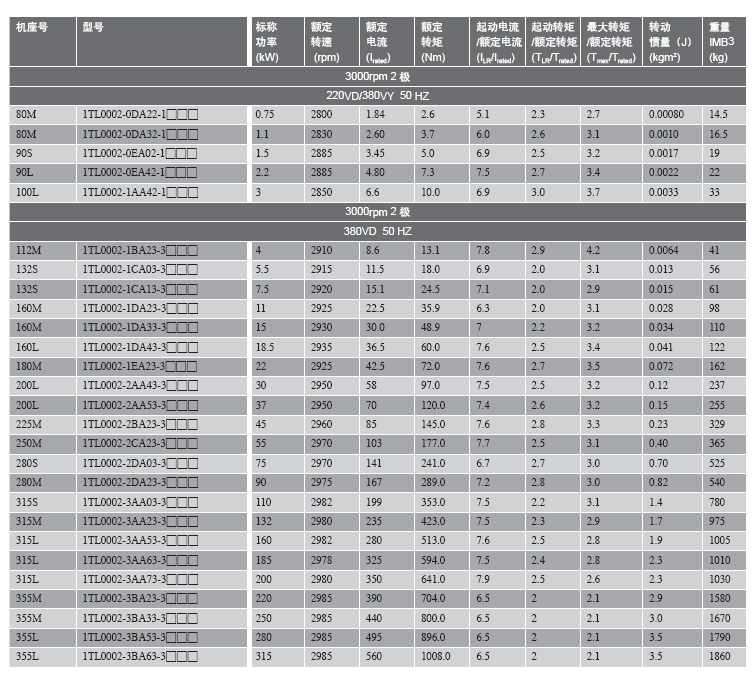 管道離心泵配西門子貝得變頻調(diào)速三相異步電動機選型技術數(shù)據(jù)表