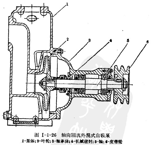 該圖為軸向回流式結(jié)構(gòu),相當(dāng)于單蝸殼離心泵加一儲水室,儲水室有回流孔與蝸殼相通,水從軸向回流入葉輪外緣及外部。
