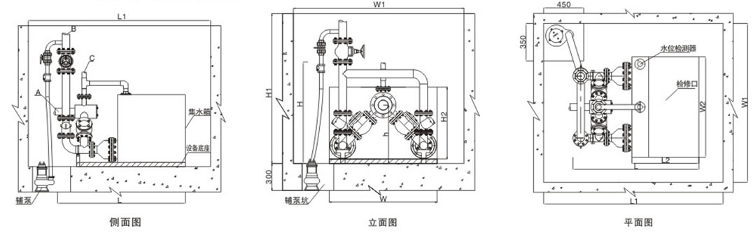 當(dāng)設(shè)備安裝在設(shè)備坑內(nèi)時(shí),設(shè)備應(yīng)配置一臺(tái)輔助水泵,目的是為了便于排出意外產(chǎn)生的積水,輔助水泵安裝在設(shè)備旁邊的預(yù)制集水槽內(nèi)。
