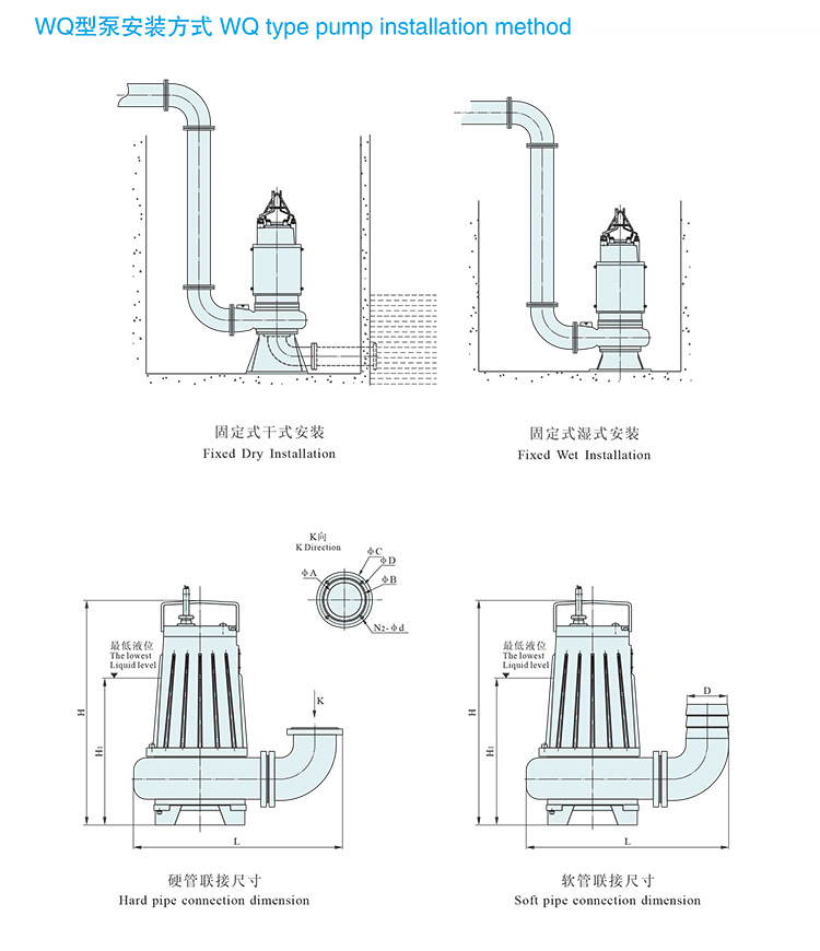 7.QW(WQ)潛水排污泵系列可根據(jù)用戶需要配備雙導(dǎo)軌自動(dòng)耦合安裝系統(tǒng),它給安裝、維修帶來更大方便,人可不必為此而進(jìn)入污水坑。
