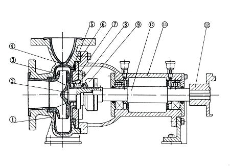 IHF型氟塑料離心泵的泵體材質(zhì)采用金屬外殼內(nèi)襯聚全氟乙丙烯(F46)、葉輪和泵蓋均采用金屬嵌件外包氟塑料整體燒結(jié)壓制成型,軸封采用外裝式波紋管機(jī)械密封,靜環(huán)選用99.9%氧化鋁陶瓷或炭化硅,動(dòng)環(huán)采用四氟填充材料或炭化硅。其特點(diǎn)是該泵結(jié)構(gòu)先進(jìn)合理,耐腐蝕強(qiáng),密封性能嚴(yán)密可靠,工作穩(wěn)定,噪音低,使用壽命長。