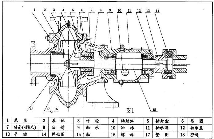 本型泵主要由:泵蓋(1),泵體(2),葉輪(3),軸(15),軸封體(4),軸承箱(11))及聯(lián)軸器部件等組成〈見(jiàn)圖1:結(jié)構(gòu)圖〉