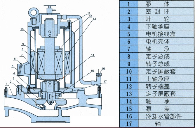 結(jié)構見圖。該泵為機泵一體結(jié)構,整機主要由泵體、葉輪、聯(lián)接體、滑動軸承、定子、轉(zhuǎn)子、屏蔽套、電機殼等零部件組成。泵為立式單級單吸離心式,進出口在同一水平軸線上,口徑規(guī)格相同可直接象閥門一樣安裝在管路的任何部位上,裝卸極為方便,占地面積省。泵通過聯(lián)接體與電機或一體,軸承采用進口石墨浸漬樹脂復合軸承,電子定轉(zhuǎn)子各有屏蔽套進行隔離。軸承采用流體本身介質(zhì)作為潤滑劑及冷卻液,具有設計合理、運行可靠的特點。泵設有底座,可直接安裝在地基上,因該泵具有低噪音,無振動特點,安裝時無需加裝隔振器或隔振墊。