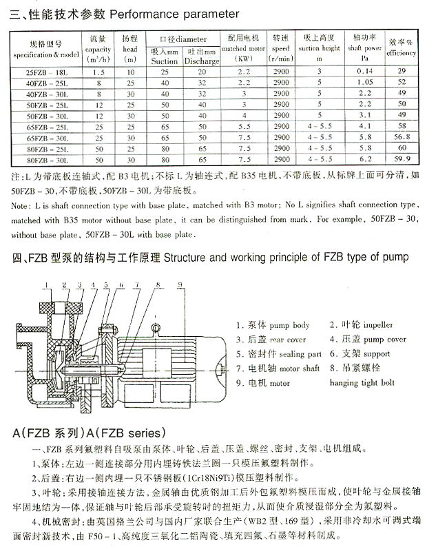 我公司生產(chǎn)的FZB系列氟塑料自吸泵,適合于在-20度到100度溫度的條件下長期輸送濃度的任意介質(zhì):酸、氧化劑及腐蝕性介質(zhì)(禁輸快速硬質(zhì)結(jié)晶體介質(zhì)),過流部分全部采用氟塑料增強聚丙烯合成(聚四氟乙烯和聚全氟乙丙烯等多種氟材料經(jīng)過合理配方)模壓加工而成,它集多種氟塑料之優(yōu)點,具有特強的耐腐蝕性,機械強度高,不老化,無毒素分解等優(yōu)點。如輸送結(jié)晶、顆粒及懸浮物需告知我公司,以便安裝相應的密封。