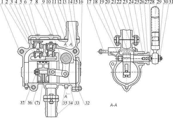 連桿(36)等傳動(dòng)機(jī)構(gòu),使活塞(7)作往復(fù)運(yùn)動(dòng)。如圖所示,當(dāng)活塞向左移動(dòng)時(shí),右端的泵缸體積逐漸擴(kuò)大,形成真空,液體從吸水管(34)經(jīng)過鑄在泵體旁邊的吸入流道頂開吸水閥進(jìn)入缸體右端。在同一時(shí)間里,缸體左側(cè)由于活塞的壓縮,使壓水閥(5)頂開,液體經(jīng)吐出管(11)排出。若活塞的運(yùn)動(dòng)方向返回向右時(shí),則泵缸左側(cè)吸入液體,泵缸右側(cè)排出液體,這樣往復(fù)不歇地把液體吸入排出。形成泵的工作。泵的壓水閥向上行程由蓋板(6)限止,吸水閥向上行程由壓水閥限止。蓋板與泵體用螺栓(8)緊固,活塞行程由泵蓋(14)和泵體限止。