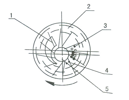 如圖(一)所示,葉輪偏心地安裝在泵體內(nèi),泵起動(dòng)時(shí),向泵內(nèi)注入一定高度的水,當(dāng)葉輪旋轉(zhuǎn)時(shí),水受離心力的作用而在泵體內(nèi)壁形成一旋轉(zhuǎn)水環(huán),水環(huán)下部內(nèi)表面與輪轂相切,沿箭頭方向旋轉(zhuǎn)時(shí),在前半轉(zhuǎn)過程中,水環(huán)內(nèi)表面逐漸與輪轂脫離,因此在葉片間形成空間并逐漸擴(kuò)大,內(nèi)部壓力低于入口處壓力,此時(shí)吸入氣體。在后半轉(zhuǎn)過程中,水環(huán)內(nèi)表面逐漸與輪轂靠近,葉片間的空間容積縮小,氣體壓力高于大氣壓時(shí)被排出。如此葉輪反復(fù)工作,泵就連續(xù)不斷地抽吸氣體。