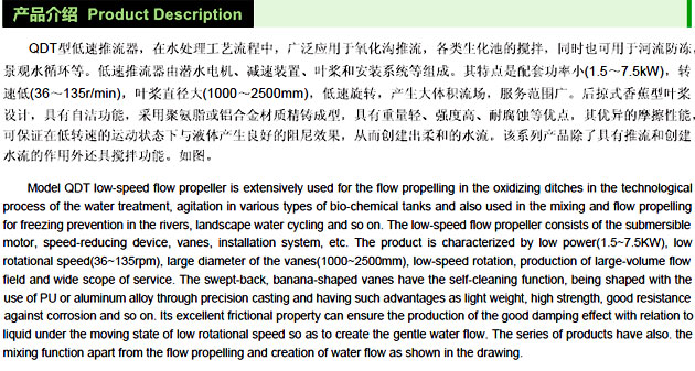 QDT型低速推流器,在水處理工藝流程中,廣泛應(yīng)用于氧化溝推流,各類生化池的攪拌,同時(shí)也可用于河流防凍,景觀水循環(huán)等。低速推流器油潛水電機(jī)、減速裝置、葉槳和安裝系統(tǒng)等組成。其特點(diǎn)是配套功率。1.5-7.5KW),轉(zhuǎn)速低(36-135r/min),葉槳直徑大(1000-2500mm),低速旋轉(zhuǎn),產(chǎn)生大體積流場,服務(wù)范圍廣。后掠式香蕉型葉槳設(shè)計(jì),具有自潔功能,采用聚氨脂或鋁合金材質(zhì)精鑄成型,具有重量輕、強(qiáng)度高、耐腐蝕等優(yōu)點(diǎn),其優(yōu)異的摩擦性能,可保證在低速的運(yùn)動(dòng)狀態(tài)下與液體產(chǎn)生良好的阻尼效果,從而創(chuàng)建出柔和的水流。該系列產(chǎn)品除了具有推流和創(chuàng)建水流的作用外還具有攪拌功能。