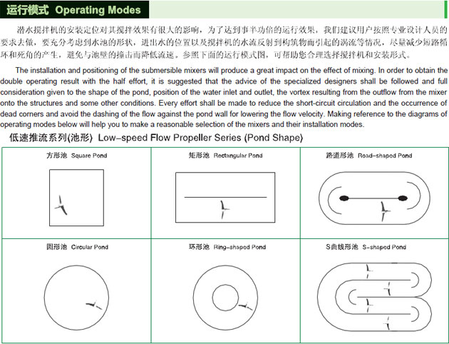 潛水?dāng)嚢铏C(jī)的安裝定位對(duì)其攪拌效果有很大的影響,為了達(dá)到事半功倍的運(yùn)行效果,我們建議用戶按照專業(yè)設(shè)計(jì)人員的要求去做,要充分考慮到水池的形狀,進(jìn)出水的位置以及攪拌機(jī)的水流反射到構(gòu)筑物向引起的渦流等情況,盡量減少短路循環(huán)和死角的產(chǎn)生,避免與池壁的撞擊而降低流速。參照下面的運(yùn)行模式圖,可幫助您合理選擇攪拌機(jī)和安裝形式。