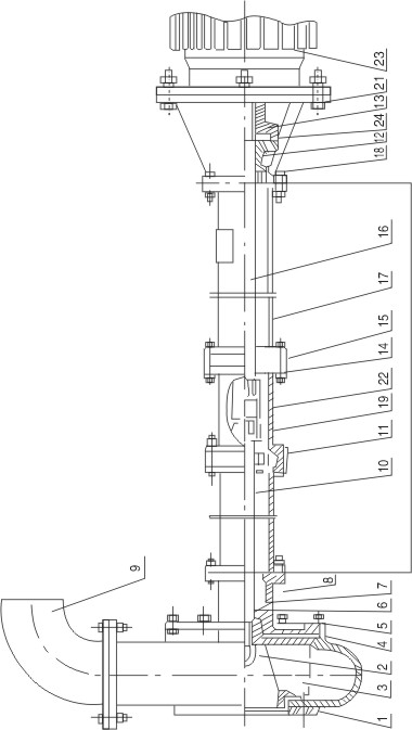 本泵系單級單吸立式離心泵,流體沿泵軸的軸線成70°方向流出,主要部件有蝸殼、葉輪、泵座、泵殼、