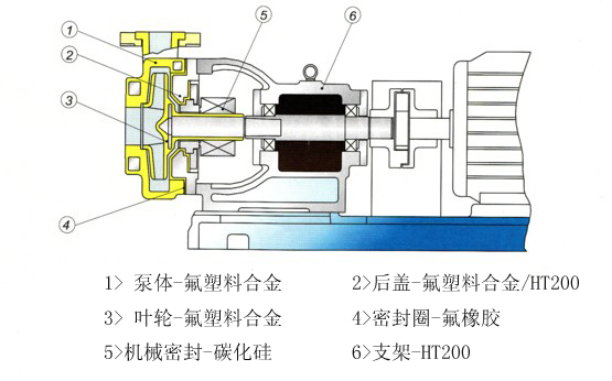 IHF襯氟離心泵按國家標準設計;泵體采用先進的生產工藝以金屬外殼緊襯氟塑料(F46)制造,泵的承重部分為金屬材料具有機械強度高、耐壓性強、抗機械沖擊力優(yōu)越等優(yōu)點;主要過流部件葉輪、泵蓋等均采用金屬嵌件外包氟塑料一次性高溫模壓而成;配置外裝式金屬波紋管機械密封,對磨材質:氧化鋁VS四氟、碳化硅VS四氟、硬質合金VS硬質合金,用戶可根據工況要求選擇對磨付。