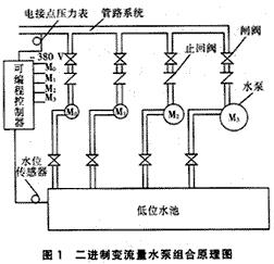 在文獻[1]中提出了一種不使用變頻器(或氣壓罐)的自動穩(wěn)壓給水方法,即二進制變流量水泵組合穩(wěn)壓給水方法,現(xiàn)介紹如下: