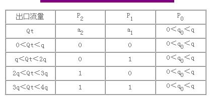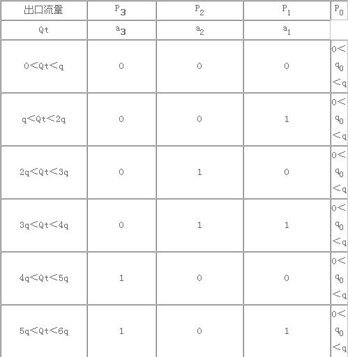 下面描述圖2給水系統(tǒng)的工作原理。對采用開關控制的水泵P1與P2,用數(shù)字1表示水泵工作,以數(shù)字0表示水泵停止工作,于是P1與 P2的組合工作狀態(tài)用一個兩位的二進制數(shù)a2a1表示(如表2)。P0采用變頻器連續(xù)調節(jié)電機轉速,把它與P1P2的組合工作相結 合,則整個給水系統(tǒng)的流量可以在0≤Qt≤4q的區(qū)間連續(xù)變化(計Qt時近似忽略了由于水泵并聯(lián)所造成的流量損失)。表2與表1的不同之處在于:由于變頻調速水泵P0的加入,可以在0≤Qt≤4q的全流量范圍內連續(xù)調節(jié)給水流量,故理論上可以實現(xiàn)高精度的恒壓控制,而不是表1所描述的在一定范圍內的穩(wěn)壓控制。同時,與傳統(tǒng)的恒壓變頻調速給水系統(tǒng)相比較,變頻器的設計選用容量可減小一半。因此,本方案兼具了二進制變流量水泵組合方案和典型變頻調速恒壓給水方案的優(yōu)點。