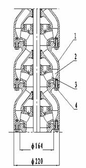 在傳統(tǒng)設(shè)計觀念的指導下,斜流式葉輪配空間導葉的水力設(shè)計和結(jié)構(gòu)形式成為深井離心泵的主要設(shè)計方法(如圖1所示),因為這種形式的水泵效率較高,流量和揚程也與國家標準規(guī)定值相符。 但是,這種形式的深井離心泵,其軸向尺寸大,葉片的制造難度大,生產(chǎn)成本高,因此,其綜合經(jīng)濟效益很低。