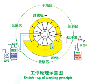 | 工作原理: 吸漿區(qū):工作時浸沒在料漿的過濾板在毛細(xì)作用下結(jié)合真空壓力,表面吸附成一層濾餅,濾液通過濾板進(jìn)分配閥至排液罐。 淋洗區(qū):濾餅轉(zhuǎn)出料漿斗后,對濾餅進(jìn)行噴淋洗滌。 干燥區(qū):濾餅繼續(xù)在水環(huán)真空泵高真空力的作用下脫水。 卸料區(qū):進(jìn)入無真空的情況下,刮刀自動卸料。 反沖洗:工業(yè)水或?yàn)V液通過分配閥進(jìn)入陶瓷板由內(nèi)向外進(jìn)行清洗。清洗堵塞的微孔。在陶瓷板使用一個周期后,采用超聲波配合低濃度酸混合清洗,保持陶瓷板的高效使用。 |