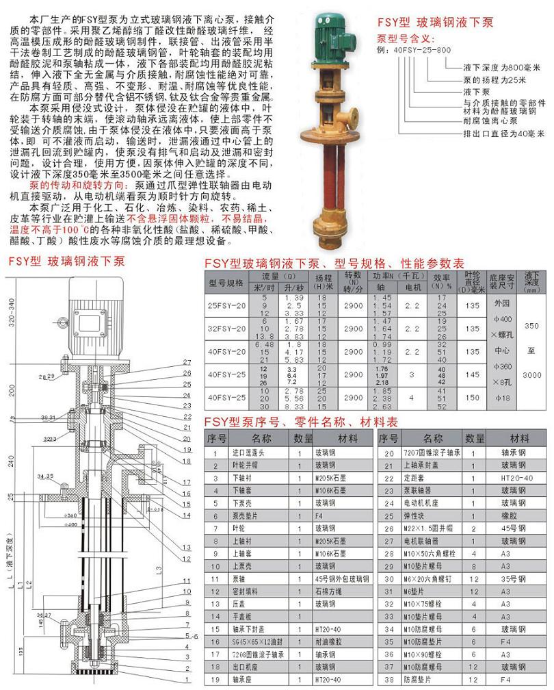 玻璃鋼(酚醛樹脂)對非氧化性酸(鹽酸、稀硫酸、磷酸等)、鹽類溶液、水都有良好的耐蝕性,不耐堿和氧化性酸(硝酸、鉻酸等)的腐蝕,高耐溫度約為120~150℃,低溫度為-20℃。本單位應用此材料生產的SY型立式玻璃鋼液下泵、WSY型泵為立式玻璃鋼液下旋渦泵、FSY型泵為立式玻璃鋼液下離心泵。該泵因伸入貯罐,貯槽的深度長短不同,設計液下深度500mm--3000mm之間任意選擇。只要液體高于泵體,即可不灌液而起動送液,平蓋板下設有泄漏孔,液體不會向貯罐外泄漏。