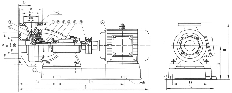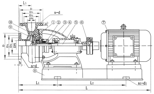 | 型號(hào) | DN | D | D1 | D2 | b | n | d | DN | D | D1 | D2 | b | n | d | L | L1 | L2 | L3 | L4 | L5 | H | H1 | n1 | d1 | KW |