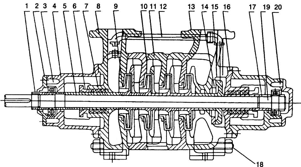 GC型多級泵的主要零件有軸、軸套、進水段、葉輪、導(dǎo)翼、密封環(huán)、中段、出水段、平衡環(huán)、平衡盤、尾蓋。