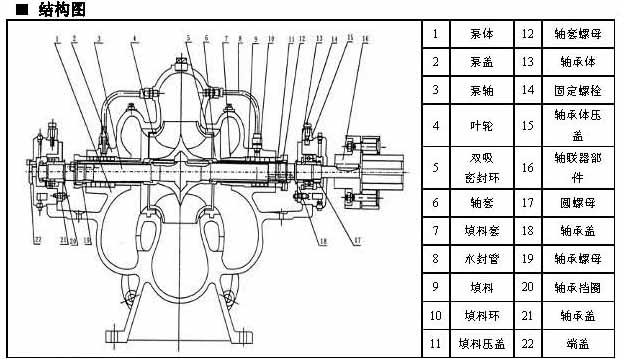 S、SH型單級(jí)雙吸泵殼中開(kāi)之離心泵,供抽磅清水或物理化學(xué)性質(zhì)類似于水的其它液體之用。被輸送液體溫度不得高于80℃。