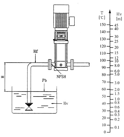 如果泵中的壓力低于輸送液體的蒸汽壓力、可能發(fā)生氣蝕,確保泵進(jìn)口側(cè)有一小壓力,大吸程H[m]可按下式計(jì)算:
