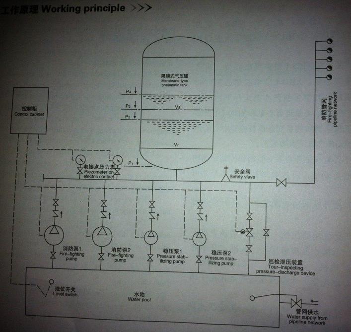 穩(wěn)壓泵工作時(shí)將水送至給水管網(wǎng),多余的水進(jìn)入氣壓罐后,水室擴(kuò)大,氣室縮小,壓力隨之升高,當(dāng)壓力升至穩(wěn)壓上限P4時(shí),水泵停轉(zhuǎn),此時(shí)氣壓罐內(nèi)被壓縮氣體的壓力將貯存的水送入管網(wǎng),氣壓罐的水室縮小,氣室擴(kuò)大,壓力隨之下降,當(dāng)壓力降至穩(wěn)壓下限P3時(shí),穩(wěn)壓泵又重新啟動(dòng).如此周而復(fù)始,穩(wěn)壓設(shè)備不斷運(yùn)行.當(dāng)發(fā)生火情時(shí),消火栓或噴頭開(kāi)啟,穩(wěn)壓泵不能滿足保壓要求,壓力繼續(xù)下降,當(dāng)壓力降至消防工作壓力P2時(shí)(或其他消防信號(hào)反饋)消防主泵自動(dòng)啟動(dòng).