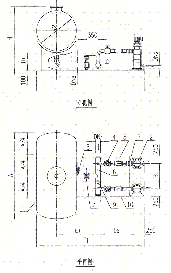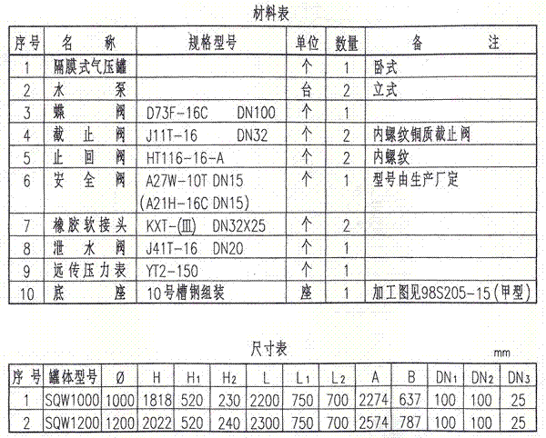 公司的ZW型消防增壓穩(wěn)壓設(shè)備是一種適用消火栓、自動噴水系統(tǒng)的新型消防供水設(shè)備。符合《高層民用建筑設(shè)計防火規(guī)范》GB50045-95及《氣壓給水設(shè)計規(guī)范》CECS76:95規(guī)定的有關(guān)技術(shù)參數(shù)。由隔膜式氣壓罐、水泵、電控箱、儀表、管道附件等組成。采用臥式氣壓罐時其組成方式如下:
