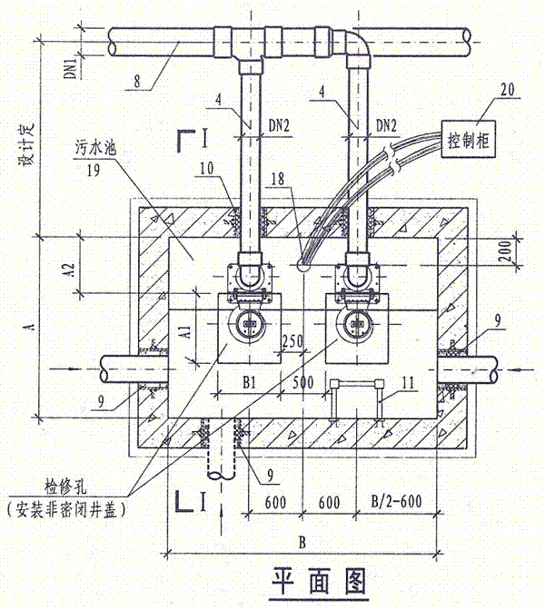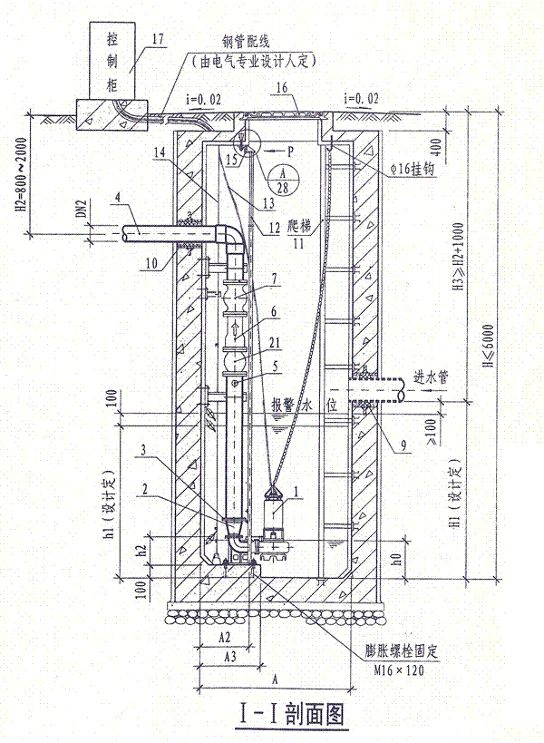 說明:1.本圖潛水排污泵采用液位自動控制。兩臺泵輪換工作,互為備用。h1為開泵水位,h0為停泵水位,當水位高出報警水位100mm時備用泵自投。