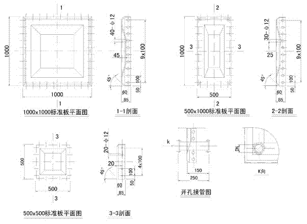 注:三種板塊均可在板內(nèi)開孔接管,其開孔位置應(yīng)盡量向板塊中心設(shè)置,而開孔接管外園與箱板翻邊的小距離不小于30