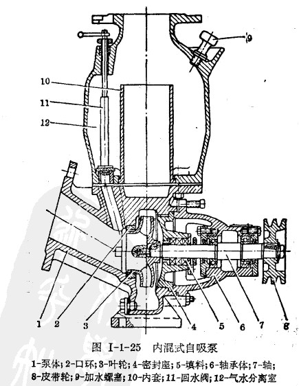 內(nèi)混式自吸泵如圖所示,吸水室是向上傾斜的,可使泵內(nèi)保持一定量的存水,泵出口處有氣水分離室,具有較大的過水面積,以造成氣水分離。在吸水室上方,開有回流孔與氣水分離室相通,形成循環(huán)水的通道;亓骺滋幯b有手動回流閥,自吸過程中打開,待正常出水后關(guān)閉。其他結(jié)構(gòu)與懸架式泵相通。