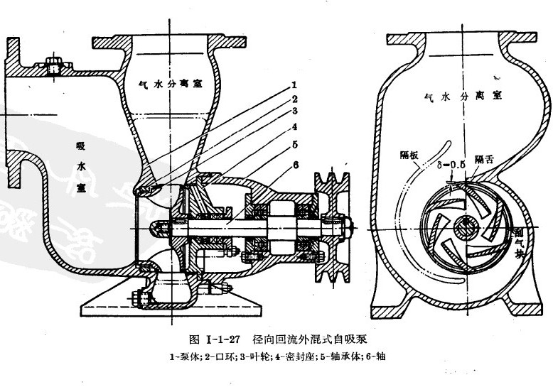 該圖為徑向回流式結(jié)構(gòu),蝸殼是雙層的,相當(dāng)于過水?dāng)嗝孑^大的單蝸殼壓水室內(nèi)加一塊曲率與其相似的隔板,把它分為內(nèi)外兩個蝸形流到,泵體上不過水?dāng)嗝孀兇,為氣水分離室,水從徑向回流入葉輪外緣及外部。