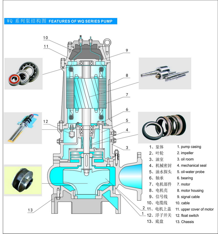 WQP型不銹鋼排污泵由電機(jī)與泵兩部分組成,二者通過油隔離室及機(jī)械密封組件隔幵,屬機(jī)電一體化產(chǎn)品, 電機(jī)與泵合用同一軸(轉(zhuǎn)子)整個水泵長度短,結(jié)構(gòu)緊湊。配備多種保護(hù)裝置,使得泵運(yùn)行安全可靠。其主要部件作用如下: