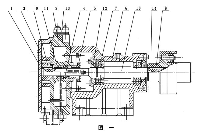 由鑄鐵制成葉輪(3),有l(wèi)2個葉片呈放射狀均分布,有平衡孔(其中兩個套扣供拆卸用)平軸向力?谑喥芥I(9)與軸(10)聯(lián)接并可沿軸向滑動調(diào)節(jié)間隙。軸為優(yōu)質(zhì)鋼制成,支承在泵的托架(6)內(nèi)的兩個滾珠軸承(17)上右端有彈性聯(lián)軸器(8)和電機直接聯(lián)接。托架(6)用鑄鐵制成,有止口保證與泵體準(zhǔn)確聯(lián)接,軸承間有空腔,可存潤滑油,用稀油或黃油滑均可。