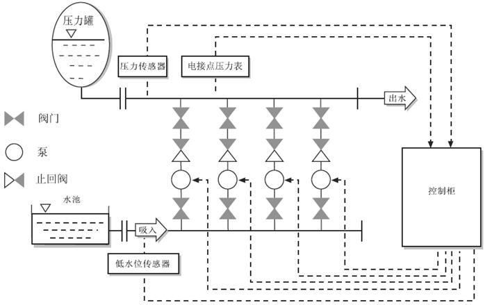 當(dāng)管網(wǎng)壓力大于啟動(dòng)壓力時(shí)設(shè)定值時(shí)由與出水管路連接的壓力罐供水,如果管網(wǎng)壓力等于啟動(dòng)壓力設(shè)定值時(shí)啟動(dòng)水泵,水泵運(yùn)行中管網(wǎng)壓力達(dá)到停止壓力時(shí)停止水泵運(yùn)行,水泵啟動(dòng)后管網(wǎng)壓力超過啟動(dòng)壓力,未達(dá)到停止壓力時(shí)水泵繼續(xù)運(yùn)行;水泵全速運(yùn)行后管網(wǎng)壓力未達(dá)到啟動(dòng)壓力時(shí)水泵追加啟動(dòng)。