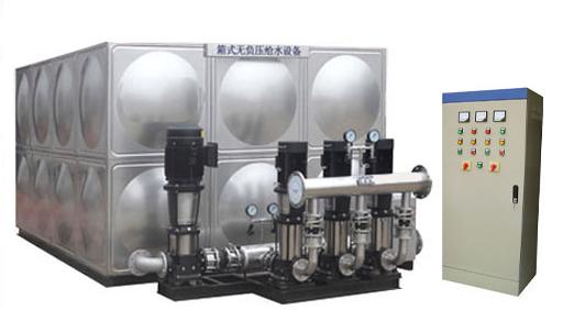 箱式管網疊壓供水設備(無負壓增壓水箱)是由水箱,防倒流裝置(根據需要設置),防負壓裝置,水泵機組,限壓保護裝置,膨脹罐(根據需要設置),控制儀表,控制柜,閥門,管路系統(tǒng),配套附件等組成,從供水管網直接吸水,通過壓力傳感器檢測出壓力,將檢測值和設定值進行比較,計算出在市政自來水管網的原有壓力的基礎上需要增加的壓力值,確定水泵投入臺數和變頻器輸出頻率,調整水泵的轉速以符合用水曲線實現(xiàn)恒壓供水或變壓供水。水箱式管網疊壓供水設備(自動增壓水箱)大程度利用了市政管網自來水的原水壓力,對市政管網不產生負壓,系統(tǒng)會定時定量或在管網供水量不足時自動切換到水箱內吸水,設備選用不銹鋼水箱和管件,減少了用水的二次污染,是新一代供水領域的節(jié)能產品。
