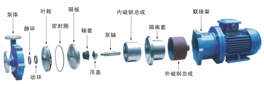 磁力泵主要構(gòu)件是泵體、葉輪、內(nèi)磁鋼、外磁鋼、隔離套、泵內(nèi)軸、泵外軸以及滑動(dòng)軸承、滾動(dòng)軸承、聯(lián)軸器等組成。