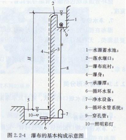 人工瀑布的基本構成是由瀑布的水源蓄水池、落水堰口、瀑布底襯、瀑身、承瀑潭或稱循環(huán)水池、循環(huán)泵、凈水設備、循環(huán)管道系統(tǒng)及照明彩燈等組成,見圖2. 2-4。