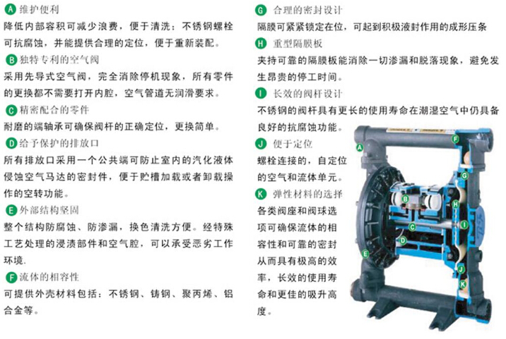 使用方便、工作可靠、開停只需簡單地打開和關(guān)閉氣體閥門,即使由于意外情況而長時間無介質(zhì)運行或突然停機(jī),氣動不銹鋼隔膜泵也不會因此而損壞,不旦超負(fù)荷,泵會自動地停機(jī),具有自我保護(hù)性能,當(dāng)負(fù)荷恢復(fù)正常后,又有自動啟動運行; 結(jié)構(gòu)簡單、易損件少,該氣動不銹鋼隔膜泵結(jié)構(gòu)簡單,安裝、維修方便,泵輸送的介質(zhì)不會接觸到配氣閥,聯(lián)桿等運動部件,不象其他類型的泵因轉(zhuǎn)子、活塞、齒輪、葉片等部件的磨損而使性能逐步下降; 可輸送較粘的液體(粘度在1萬厘泊以下); 本泵無須用油潤滑,即使空轉(zhuǎn),對氣動不銹鋼隔膜泵也無任何影響,這是該泵一大特點。