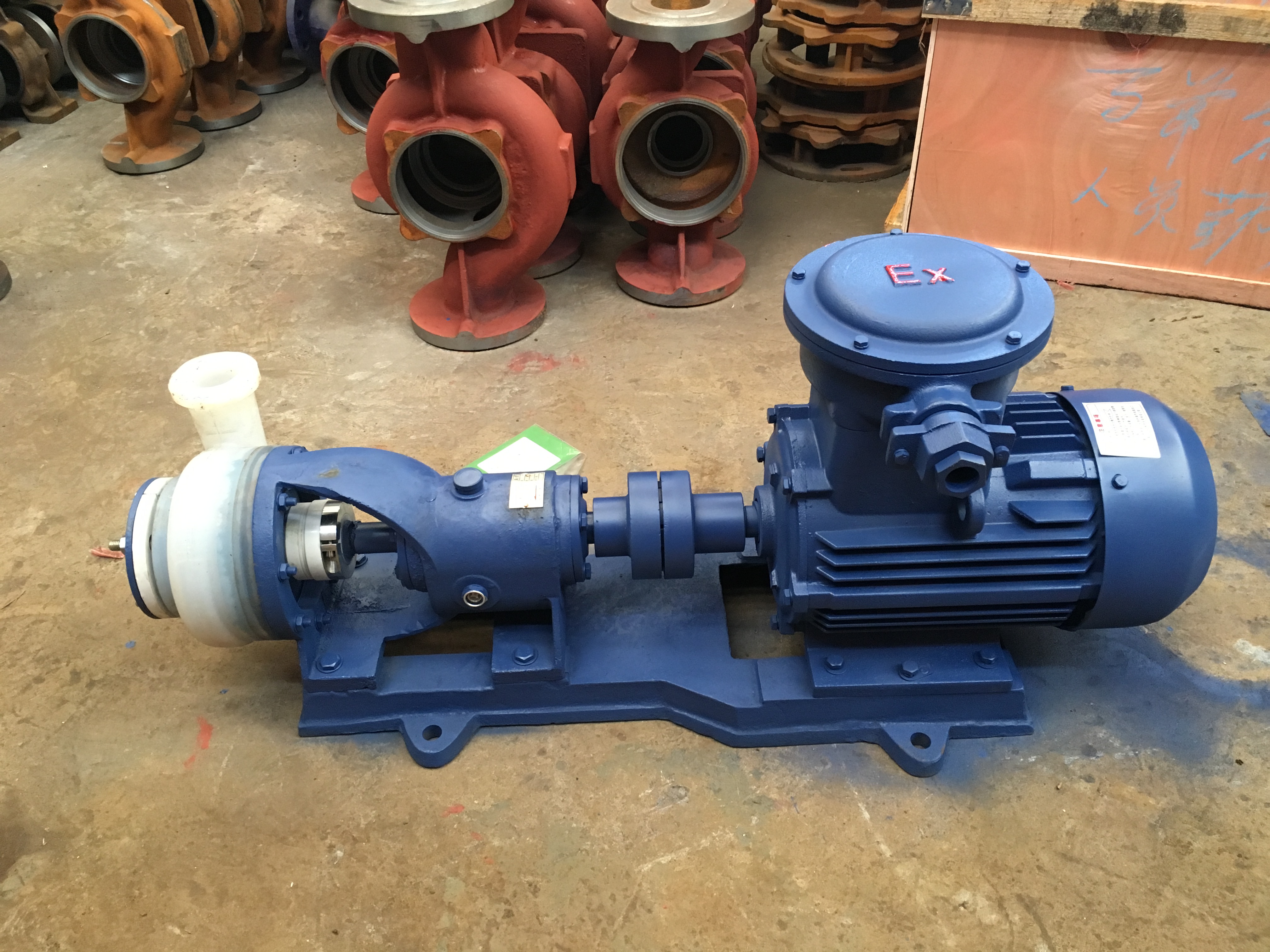 是一種離心式化工泵,其泵頭全部采用氟塑料模制而成,主要材料是高分子材料、F26材質(zhì)、F46材質(zhì) 、氟塑料合金材質(zhì)的。因材質(zhì)不同價格也誤差比較大。此類泵一般用于進出管道口徑要求相對較小,流量揚程要求較低的工礦中輸送化學流體。因泵頭全部采用氟塑料制造,因此機械強度相對比較弱,易開裂老化,在維修時必須拆卸泵的進出口管道。否則很容易在維修安裝過程中因外力,管道重力而損壞泵體.