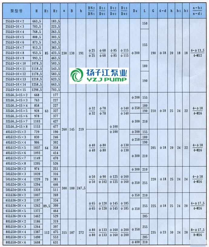 LG型高層建筑多級(jí)給水泵安裝尺寸表: