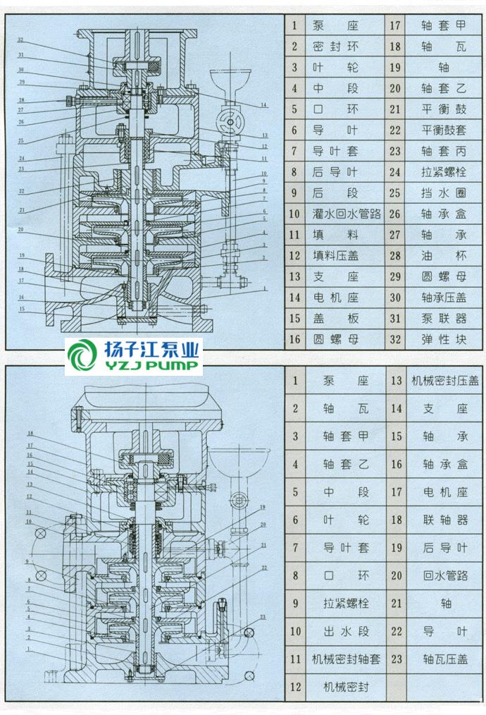 LG型泵的主要零件有:泵座、中段、后段、葉輪、導葉套、導葉、后導葉、支座、電機座、軸、軸承、軸套、密封環(huán)、平衡鼓、平衡鼓套等。(25LG、32LG、40LG三種泵沒有平衡鼓和平衡鼓套,而設有水封環(huán).裝在填料腔的底部。