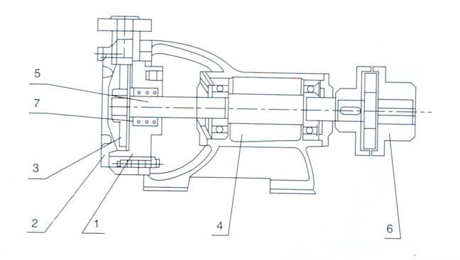 W型分聯(lián)式旋渦泵的主要零件(見結構圖)有(1)泵(2)泵蓋(3)葉輪(4)托架結合體(5)泵軸(6)爪型彈性聯(lián)軸器(7)特別組合體機械密封。該型泵與電機合裝在同一底座上.進、出口方向為斜鑰上.經接彎管可変為垂直向上。葉輪在軸上能夠自由地作軸向移動,泵在工作中葉輪能自行調節(jié)好與泵體和泵蓋之間的間隙。