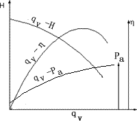 (2)離心泵的性能曲線 從前面的討論可以看出,對(duì)一臺(tái)離心泵,在轉(zhuǎn)速固定 的情況下,其壓頭、軸功率和效率都與其流量有一一對(duì)應(yīng)的關(guān)系。這些關(guān)系的圖形表示就稱為離心泵的性能曲線,包括qV-H曲線、qV-Pa曲線和qV-η曲線,這些關(guān)系一般都通過實(shí)驗(yàn)來測(cè)定。 離心泵的特性曲線一般由離心泵的生產(chǎn)廠家提供,標(biāo)繪于泵產(chǎn)品說明書中,其測(cè)定條件一般是20℃清水,轉(zhuǎn)速也固定。典型的離心泵性能曲線如圖所示。