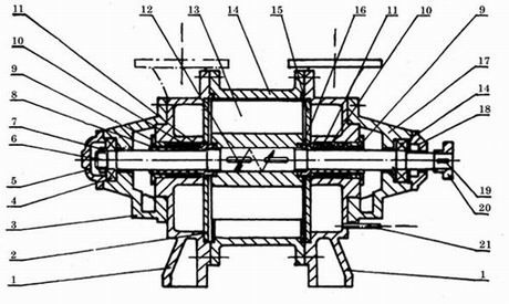 9. 填料壓蓋 10.填料壓圈 11.填料 12.平鍵 13. 葉輪 14.泵體 15.吸氣園盤 16.前軸套 17.前軸承架18.前軸承壓蓋 19.平鍵 20.聯(lián)軸器 21.進(jìn)水管