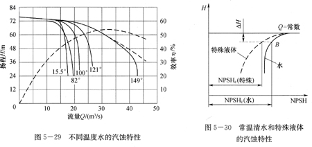 特殊液體是指和常溫清水不同的液體,如高溫水和油等。實驗表明,不同溫度的水的汽蝕對泵性能影響的趨勢如圖5-29所示。