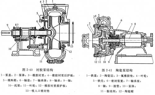 陶瓷泵結(jié)構(gòu)如圖2—41所示。陶瓷泵主要過(guò)流零件用材見(jiàn)表2—12,近年,已采用氧化鋯陶瓷制造泵的關(guān)鍵零部件,如磁力驅(qū)動(dòng)陶瓷泵的隔離套等。