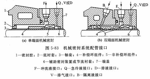 為了防止注入流體的泄漏,需要采用輔助密封,如襯套密封、油封或填料密封。急冷或阻封流體一般用水、蒸汽或氮?dú)狻R后w的壓力通常為0.02~0.05 MPa,進(jìn)出口的溫差控制在3~5℃為宜。圖5-83為典型機(jī)械密封系統(tǒng)配管接口,其中包含急冷(阻封)接口及密封急冷液的輔助密封。