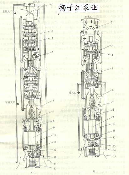 1-吸入吐出體2-出水殼3-導(dǎo)口1- 4-葉輪5-泵軸6一下吸人體 7-甩砂環(huán)8-上導(dǎo)軸承 9一轉(zhuǎn)子 10一定子11-下導(dǎo)軸承12-上止推軸承 13止推軸承14-吸水罩 15一調(diào)壓囊